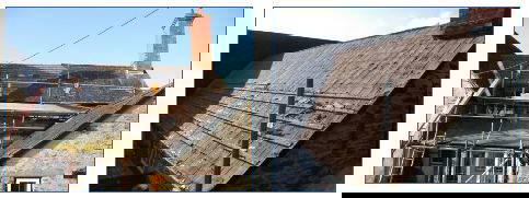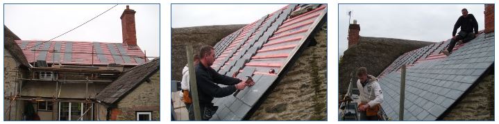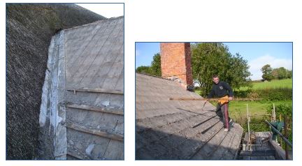 Our slate roofers have been busy re-building a slate roof near Dulverton in Devon. This slate roof was really two roofs and was adjoined to a thatched roof. The job was priced to include all materials and labour and some pretty extensive timber work needed repairing, on completion the customer received a 20 year guarantee. The scaffold is up and the old slates are removed