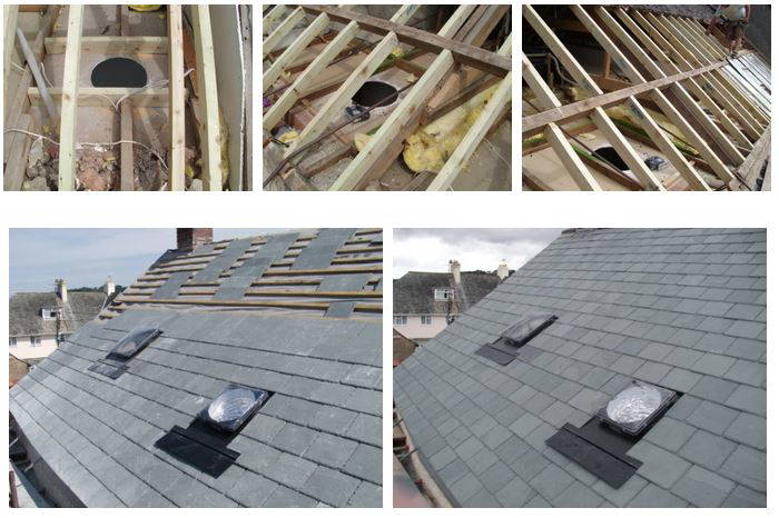 The customer also wanted a couple of Light Domes fitted which would bring natural sunlight to parts of the property that could not have a conventional window fitted. The pictures below show the light domes being installed as the roof is slated.
